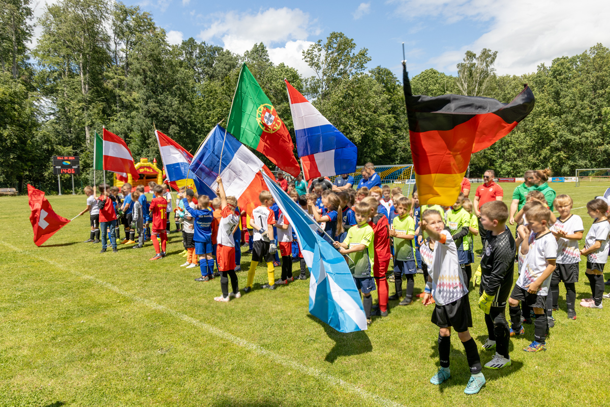 Nachdem das Regenradar immer wieder beobachtet wurde, ging es mit etwas Verzögerung um 9:30 Uhr endlich los – die Bambini-Mannschaften liefen mit Nationalflagge zum EM-Song „Fire“ ins Stadion ein. Ein Gänsehautmoment, nicht nur für die Spielerinnen und Spieler, sondern auch für die vielen Eltern und Fans am Spielfeldrand. Die Eltern unserer Ehrenhainer Mannschaft staunten nicht schlecht, als sie ihre Kinder plötzlich in Trikots mit den Farben Schottlands aus der Kabine kommen sahen. Stolz trugen die kleinen „Bravehearts“ die Fahne und Farben. Auch andere Mannschaften traten in Farben der von ihr vertretenen Nation an, was die EM-Stimmung perfekt machte.